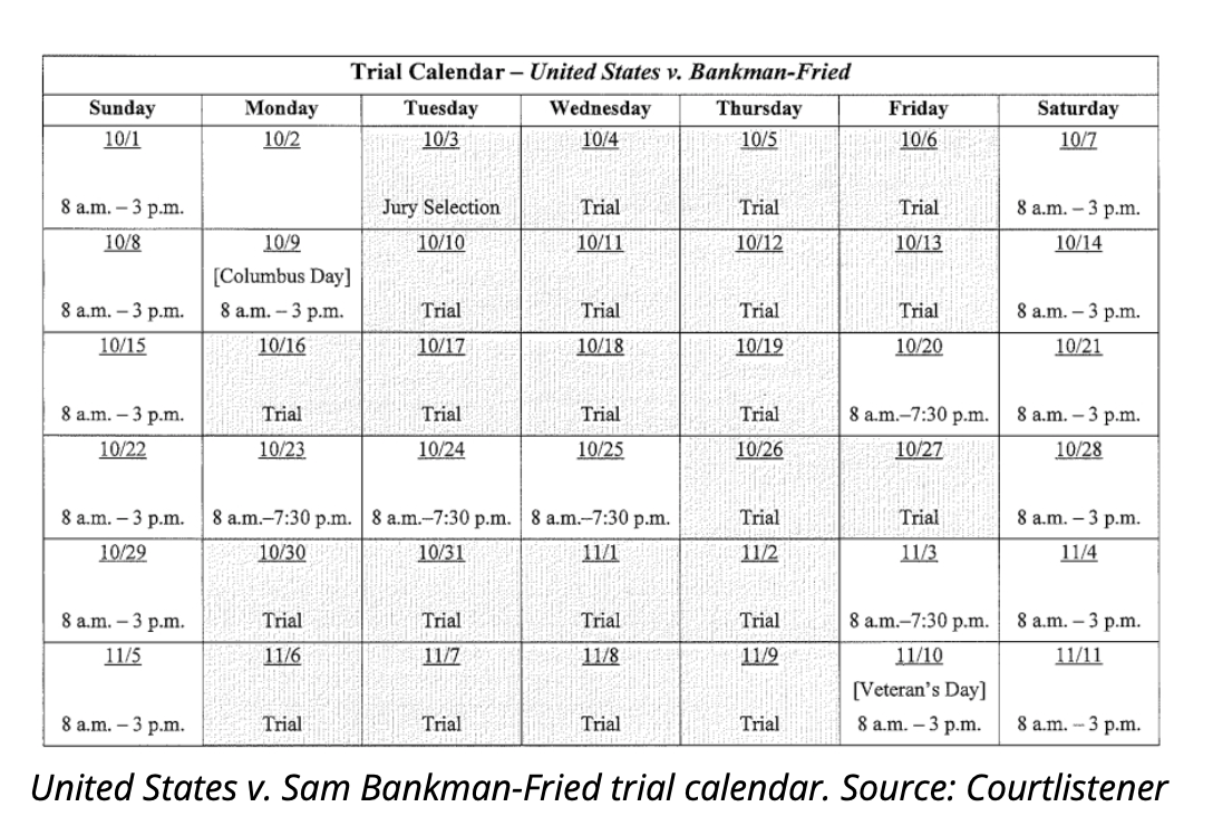 Tomorrow, Sam Bankman-Fried will take the courthouse stage, facing 21 days in court during his criminal trial scheduled to end on November 9th. Specifically, SBF stands accused of seven counts of conspiracy and fraud relating to the collapse of FTX, including fraud, money laundering and campaign finance offenses in addition to commodities fraud, securities fraud, and conspiracy to defraud the United States and commit campaign finance violations due to an extradition agreement with the Bahamas from where Bankman-Fried had been deported.
